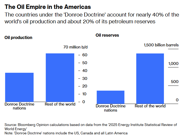 The Donroe Doctrine is underpinned by a hard geoeconomic reality: the United States now sits at the centre of a de facto hemispheric oil empire. Taken together, US, Canadian and Latin American production accounts for close to 40% of global oil output, giving Washington an unprecedented ability to shape supply, prices and market access. By pulling these barrels under a single security and political umbrella – whether through direct control, influence or alignment – the US has sharply reduced its historic vulnerability to energy shocks and gained new leverage over both allies and adversaries.